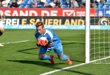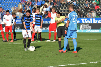 Schiedsrichterin Riem Hussein gibt einen Elfmeter nach Foul - Torwart Tim Boss (Fortuna)
