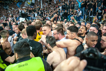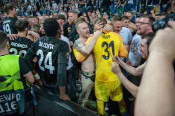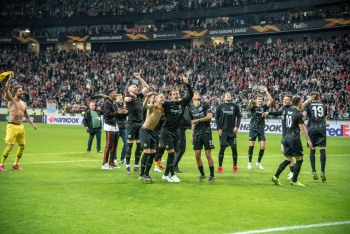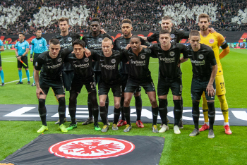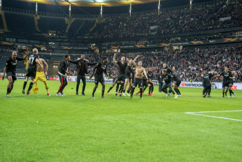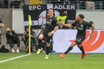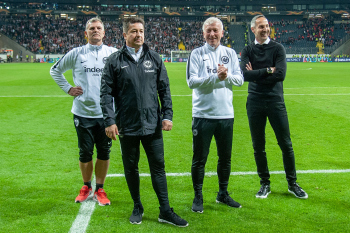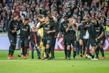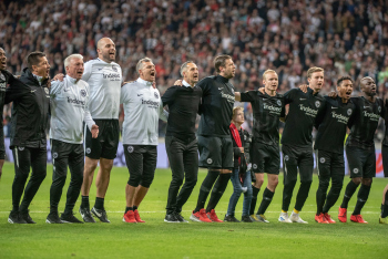 Jubel und Freude bei Marco Russ, Torwart Kevin Trapp, Makoto Hasebe, Sebastian Rode und Sebastian Haller (Eintracht Frankfurt).