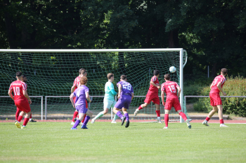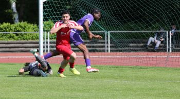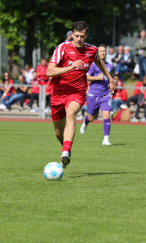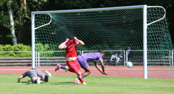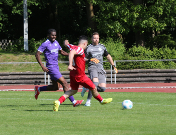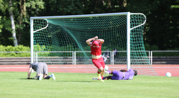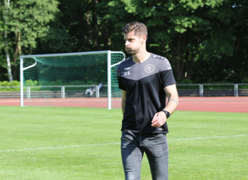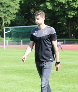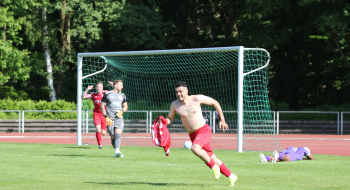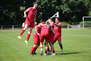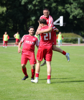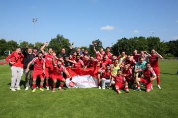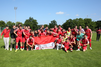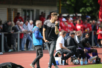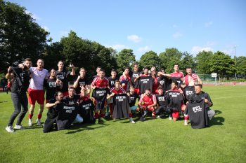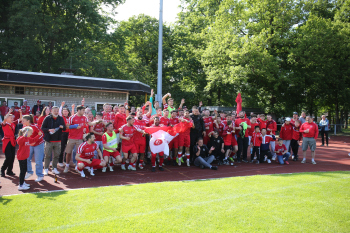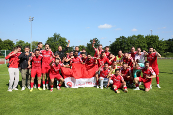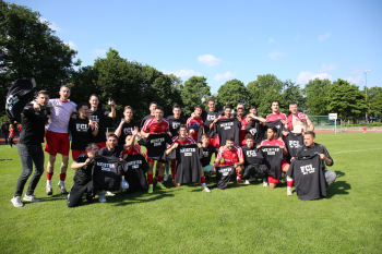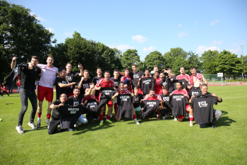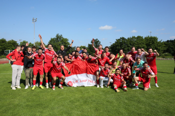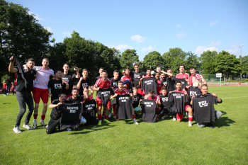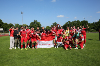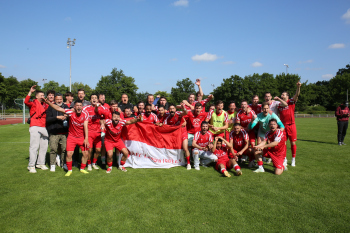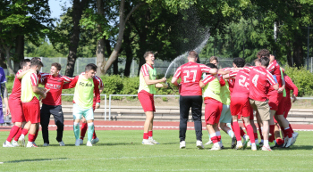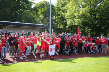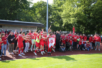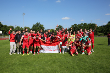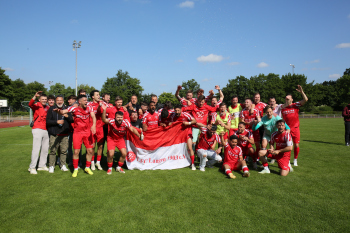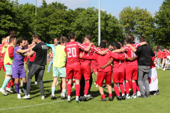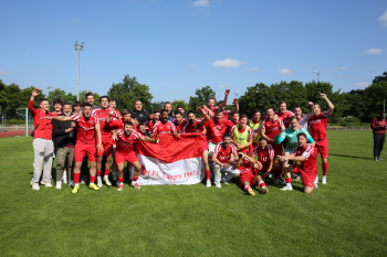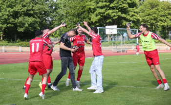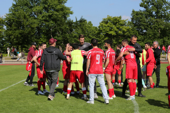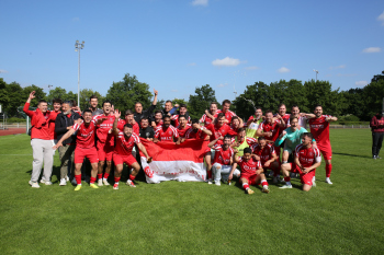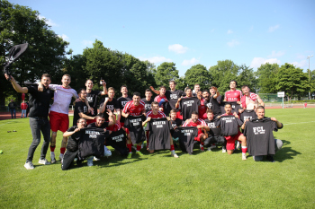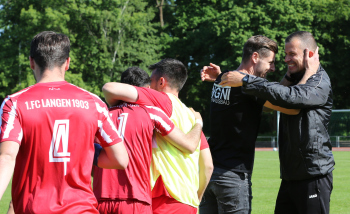 Trainer Marco Betz FC Langen feiert mit seinem Team ausgelassen die Meisterschaft in der Gruppenliga