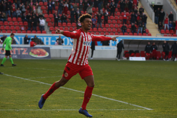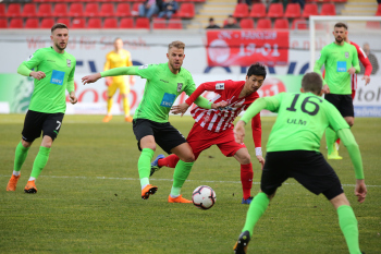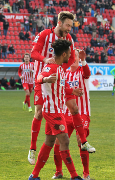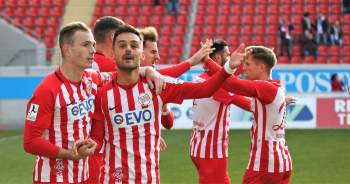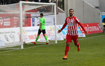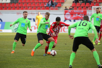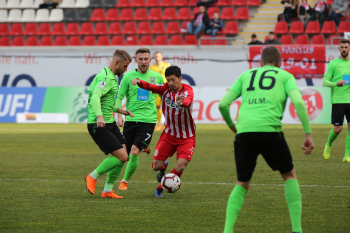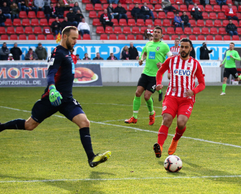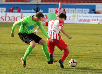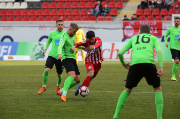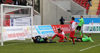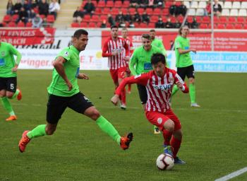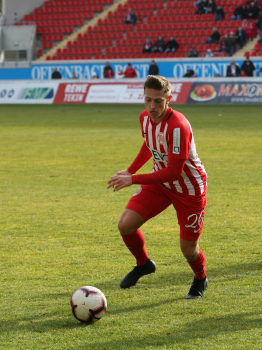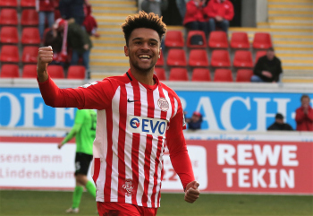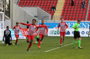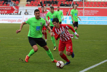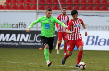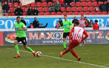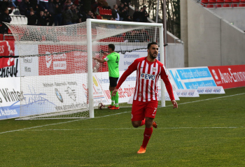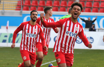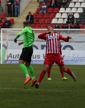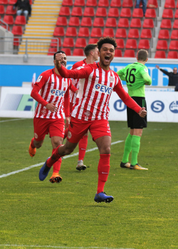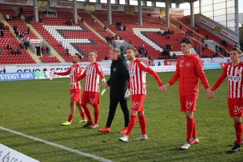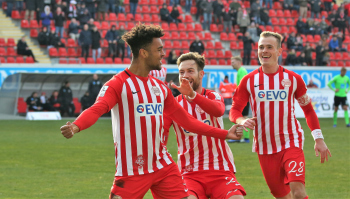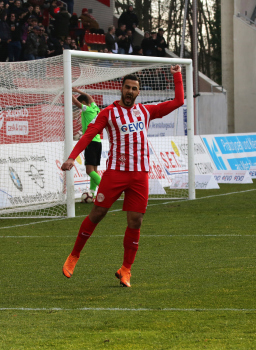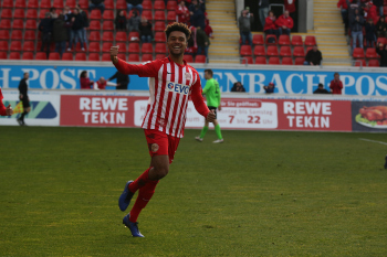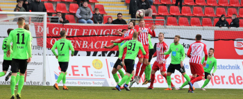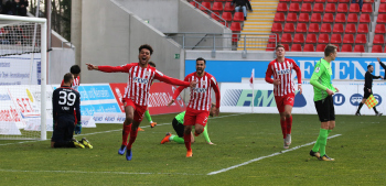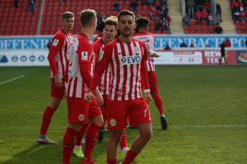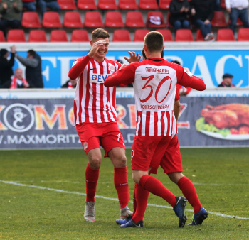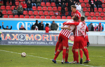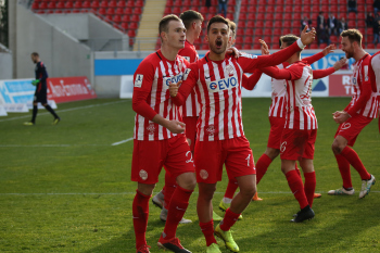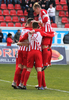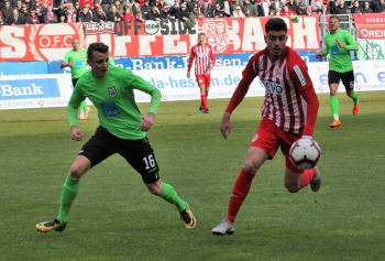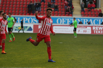 Jubel über das Tor zum 2:0 durch den Torschützen Varol Akgöz (7, OFC), hier jubeln Benjamin Kirchhoff (28, OFC) und Dren Hodja (10, OFC)