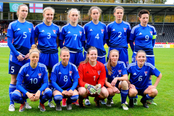 Die Starterlf von Färör, h.R.v.L. Susanna Maria Hansen (FRO), Brina Mikkelsen Tummasardottir (FRO), Asla Johannesen (FRO), Liv Arge Finnbogadottir (FRO), Birita Nielsen Bergsdottir (FRO), Rannva Biskopsto Andreasen (FRO), v.R.v.L. Kristina Olga Hansen (FRO), Eyovor Klakstein (FRO), Torhüterin Monika Biskopstö (FRO), Anna Sofía Sevdal (FRO), Heidi Sevdal (FRO).