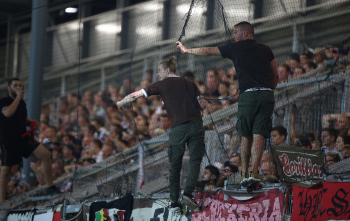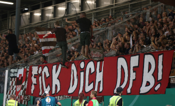 Transparent "Fick dich DFB", Vorsaenger auf dem Zaun vom Fanblock St. Pauli, Fans, Stimmung, Fahnen