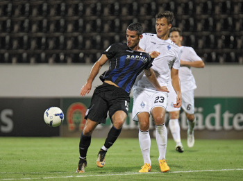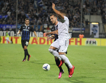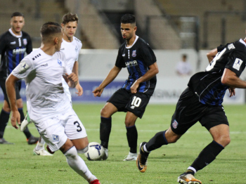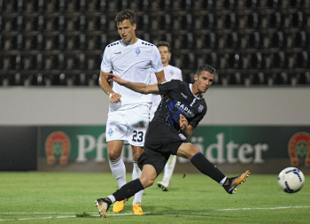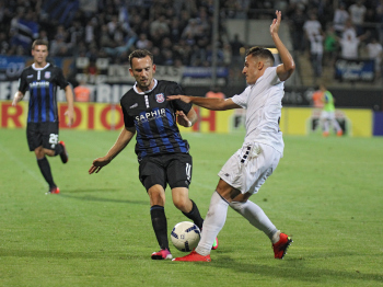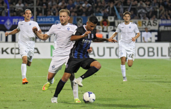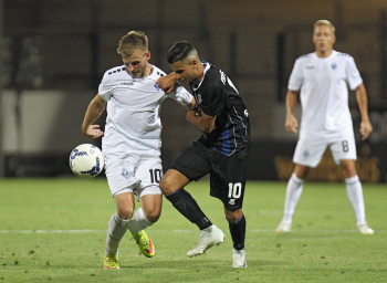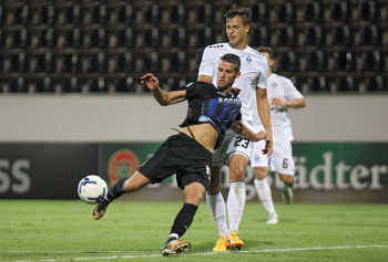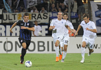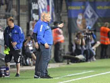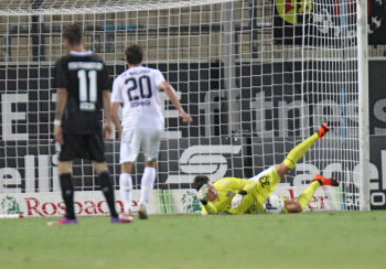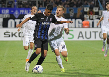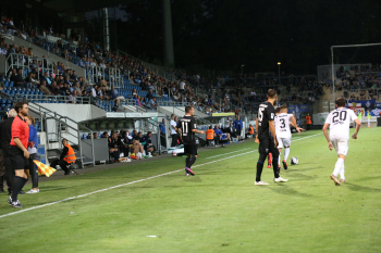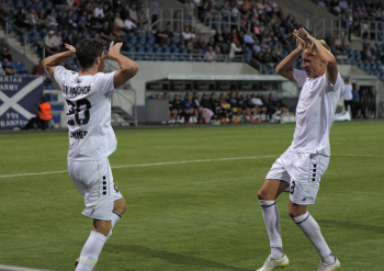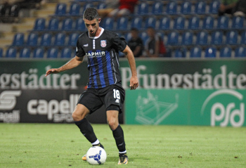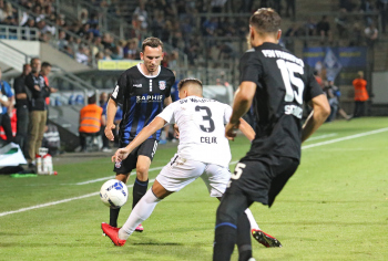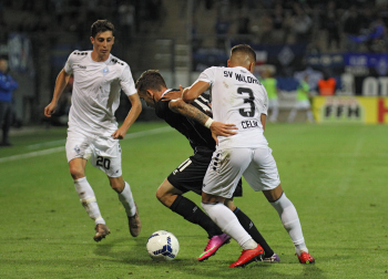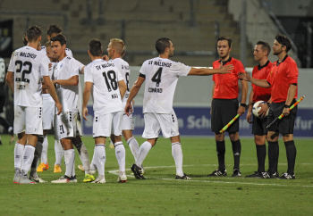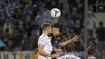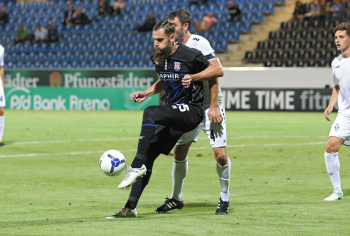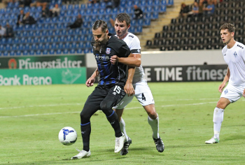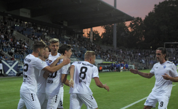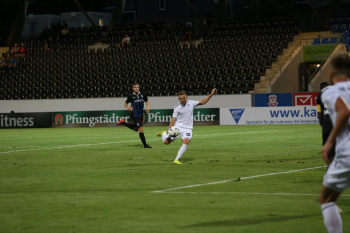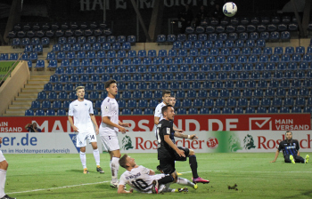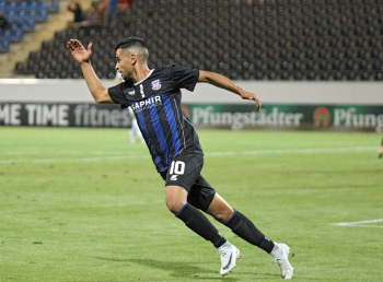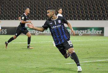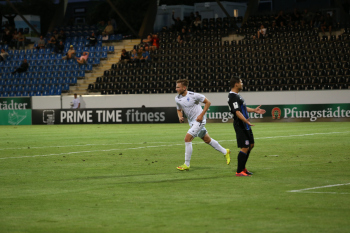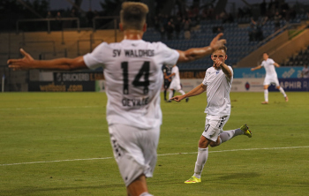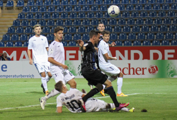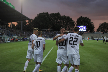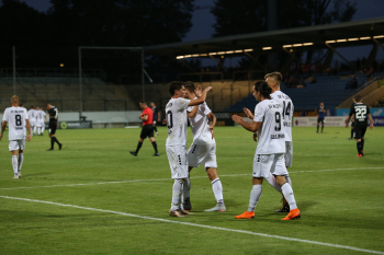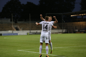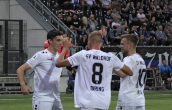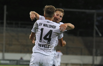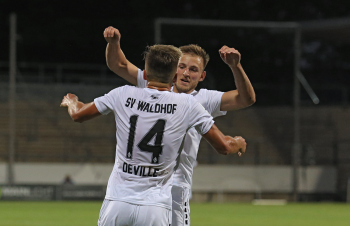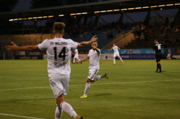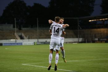13.08.2018, xxx, Frankfurt, PSD Arena, Regionalliga Suedwest, Saison 2018/2019, FSV Frankfurt gegen SV Waldhof Mannheim vl.: Jubel nach dem 0:4 durch Timo Kern (SV Waldhof Mannheim), mit Maurice Deville (SV Waldhof Mannheim), Valmir Sulejmani (SV Waldhof Mannheim), Maurice Deville (SV Waldhof Mannheim),