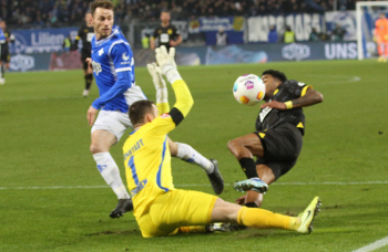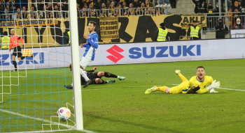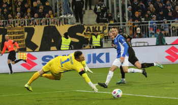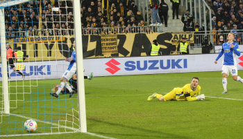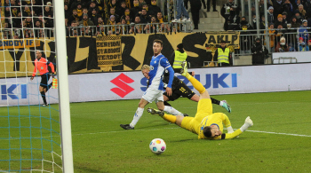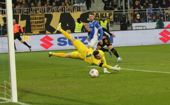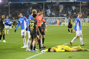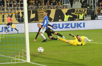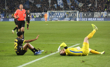 Matthias Bader (26, SV98) und Torwart Marcel Schuhen (1, SV98) gegen Ian Maatsen (22, BVB)