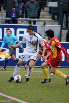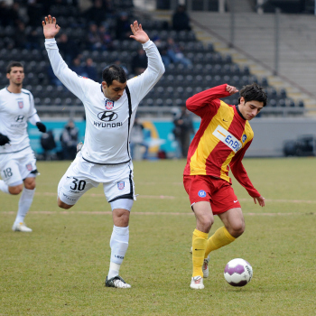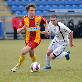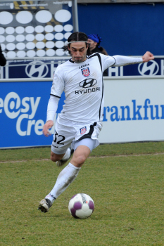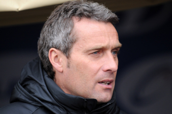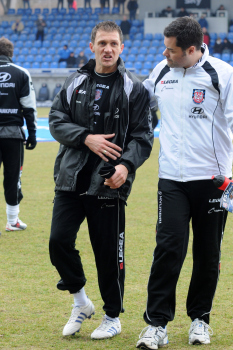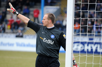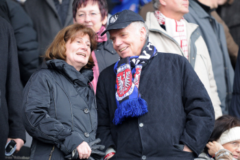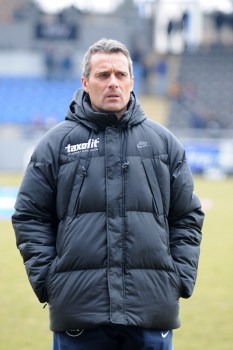 21.02.2010, 2. Bundesliga, 23. Spieltag: FSV Frankfurt vs Karlsruher SC, zeigt nach vorne Trainer Hans-J?rgen Boysen (FSV) nach dem Sieg