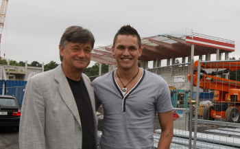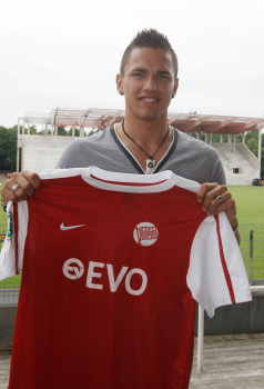 Neuverpflichtung Pascal Testroet (OFC) mit dem Trikot vor der Waldemar Klein Comic Wand