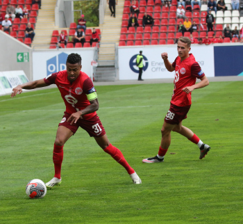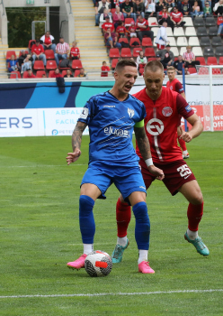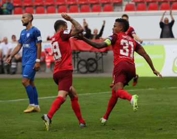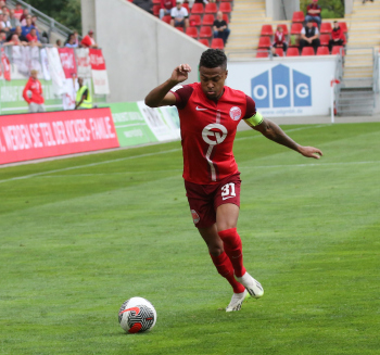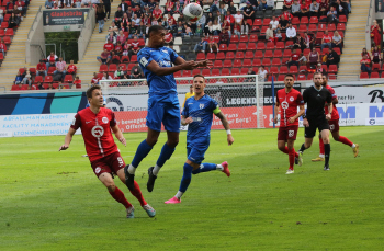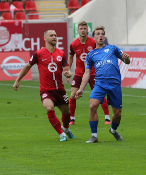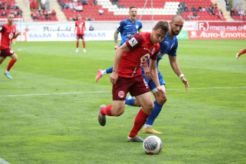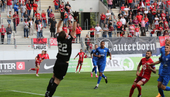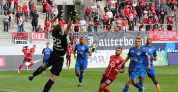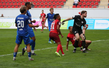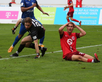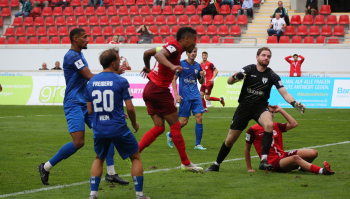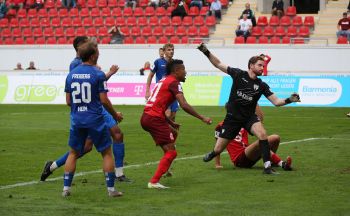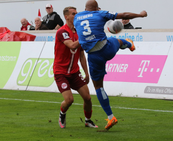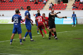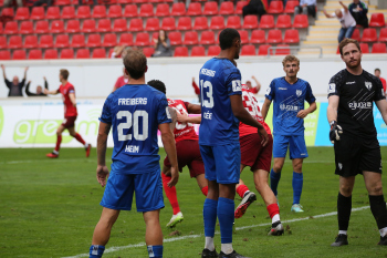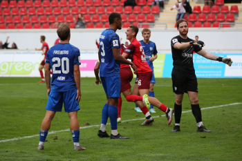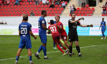 Jan Urbich (36, OFC) vergibt die Torchance, Torwart Eric Gründemann (Freiberg) weit vom Tor, Ronny Marcos (31, OFC) nutzt die Chance und macht das Zor zum 1:0