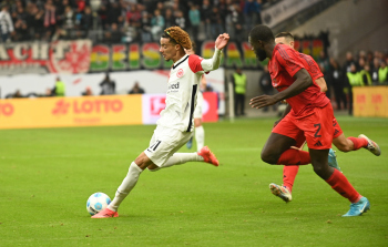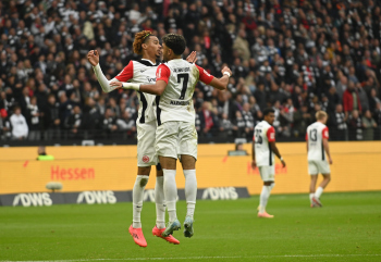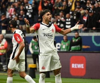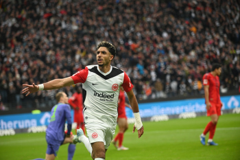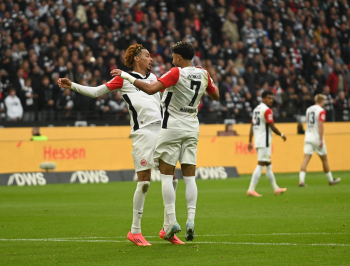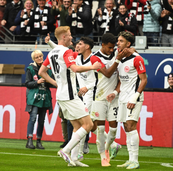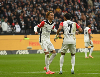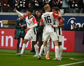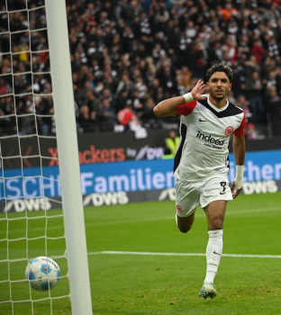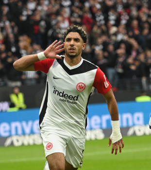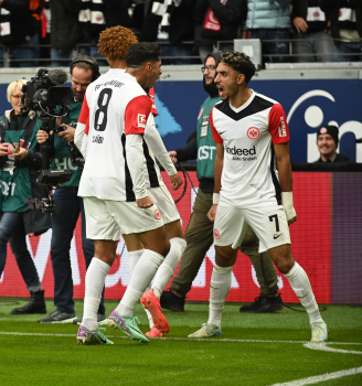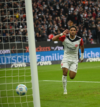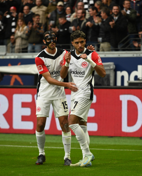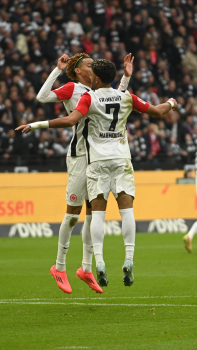 Torjubel nach dem Tor zum 1:1 Ausgleich von Omar Marmoush (7, Eintracht Frankfurt), hier mit Farès Chaïbi (8, Eintracht Frankfurt)