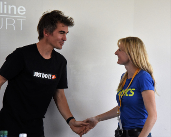 Bild zeigt: Arne Gabius und Dieter Otto, Leiter der Festhalle bei der Messe Frankfurt