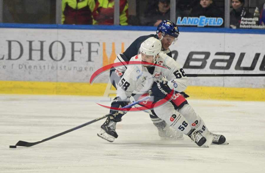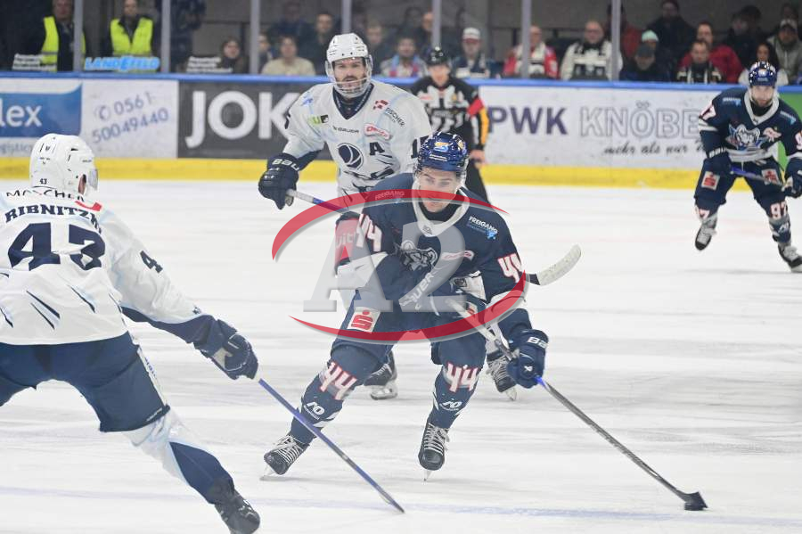 23.12.2025 xkhx Kassel, Probonio Arena Eishockey DEL 2 Saison 2025/2026 Kassel Huskies gegen Blue Devils Weiden Mitchell Hoelscherr (44, Kassel Huskies) gegen Fabian Ribnitzky (Weiden)