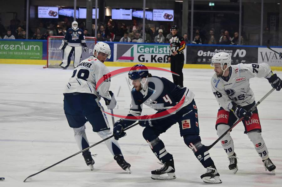 23.12.2025 xkhx Kassel, Probonio Arena Eishockey DEL 2 Saison 2025/2026 Kassel Huskies gegen Blue Devils Weiden Bode Wilde (4, Kassel Huskies) gegen Noah Samanski und Calvin Pokorny (Weiden)