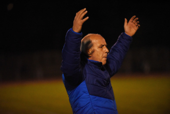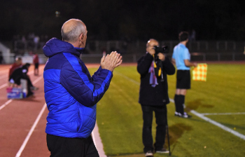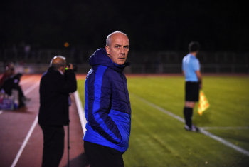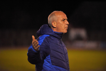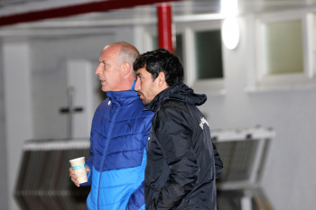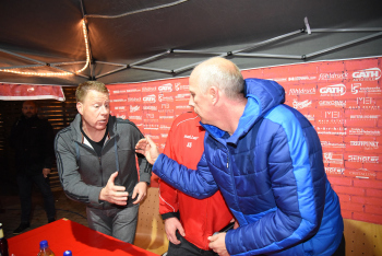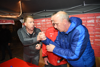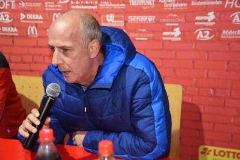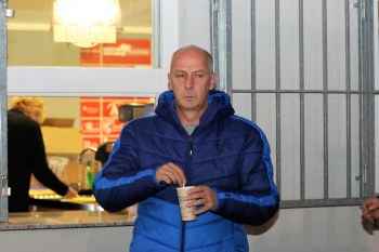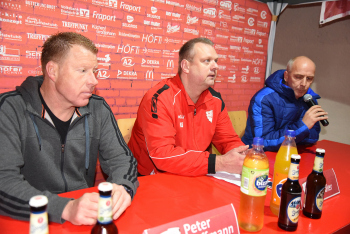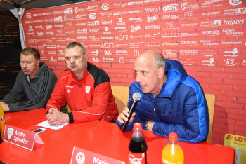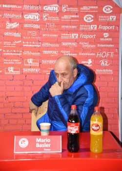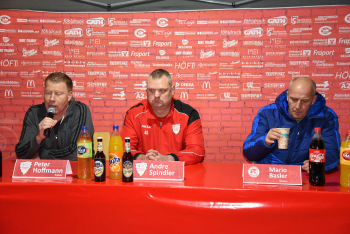 enttäuscht Trainer Peter Hoffmann (03), daneben Stadionsprecher Andre Spindler, rechts Trainer Mario Basler (RW Frankfurt)