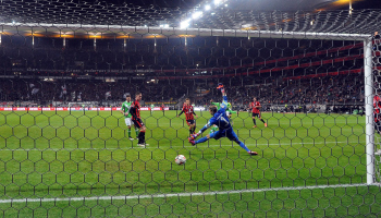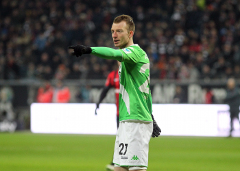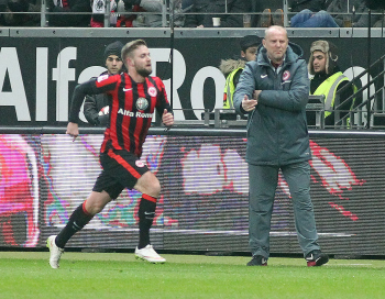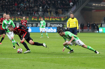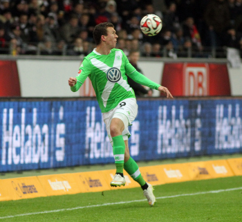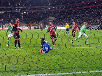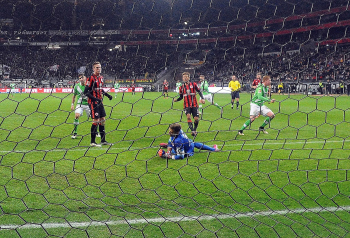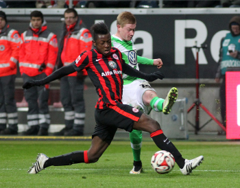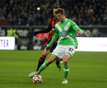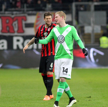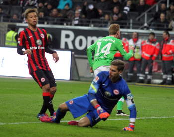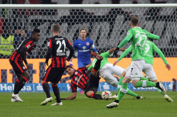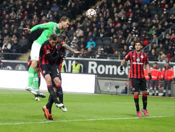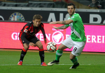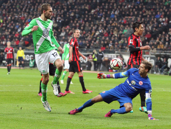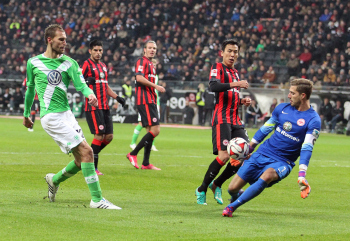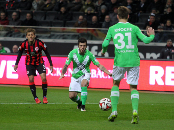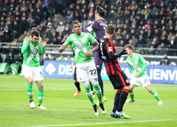 FRANKFURT, DEUTSCHLAND. 03.02.2015, FUSSBALL - Eintracht Frankfurt vs VfL Wolfsburg, 1. Bundesliga, Saison 2014-2015, Commerzbank Arena. Bild zeigt: Ivan PERISIC (VfL Wolfsburg), Luiz GUSTAVO (VfL Wolfsburg), Torwart Diego BENAGLIO (VfL Wolfsburg), Haris SEFEROVIC (Eintracht Frankfurt)