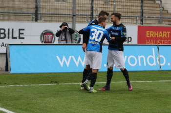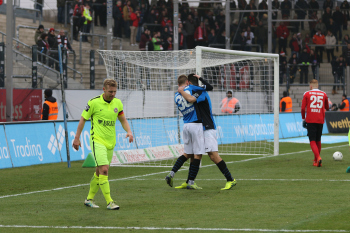 Torjubel nach dem Tor zum 2:1 durch den Torsch?tzen Maurice Deville (FSV Frankfurt) mit Fabian Graudenz und Fabian Schleusener (FSV Frankfurt)