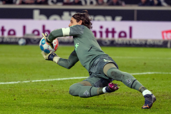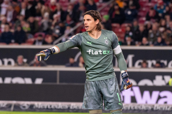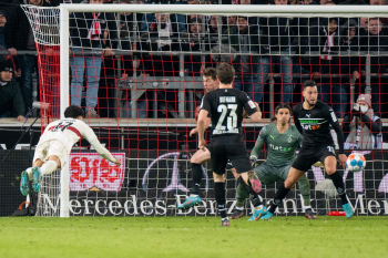Wataru Endo (VfB Stuttgart), Kouadio Kone, Florian Neuhaus (Borussia Moenchengladbach), Sasa Kalajdzic (VfB Stuttgart) und Nico Elvedi (Borussia Moenchengladbach) schauen dem Ball nach wie er ins Tor geht.