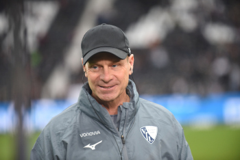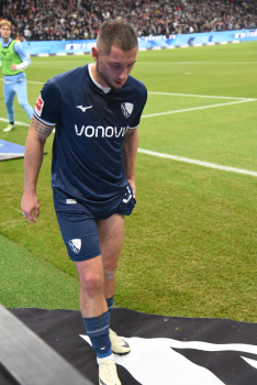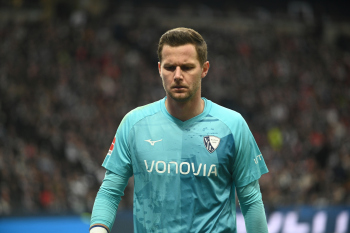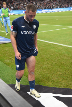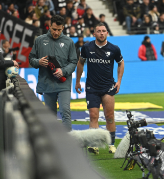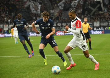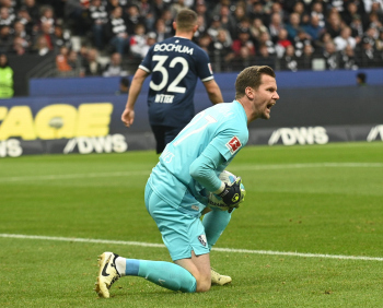 Torwart Patrick Drewes (Bochum), holt sich den Ball aus dem Tor Hugo Ekitike (11, Eintracht Frankfurt)