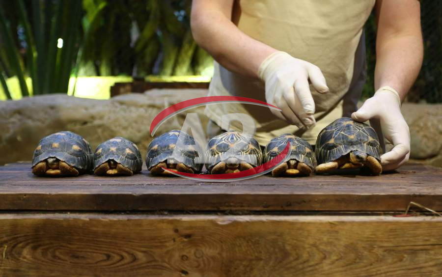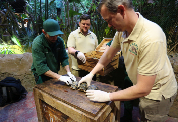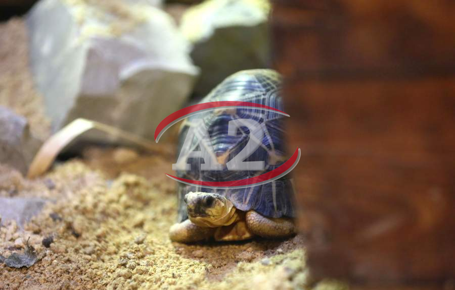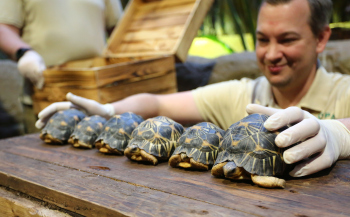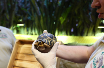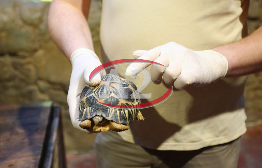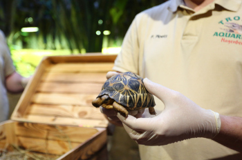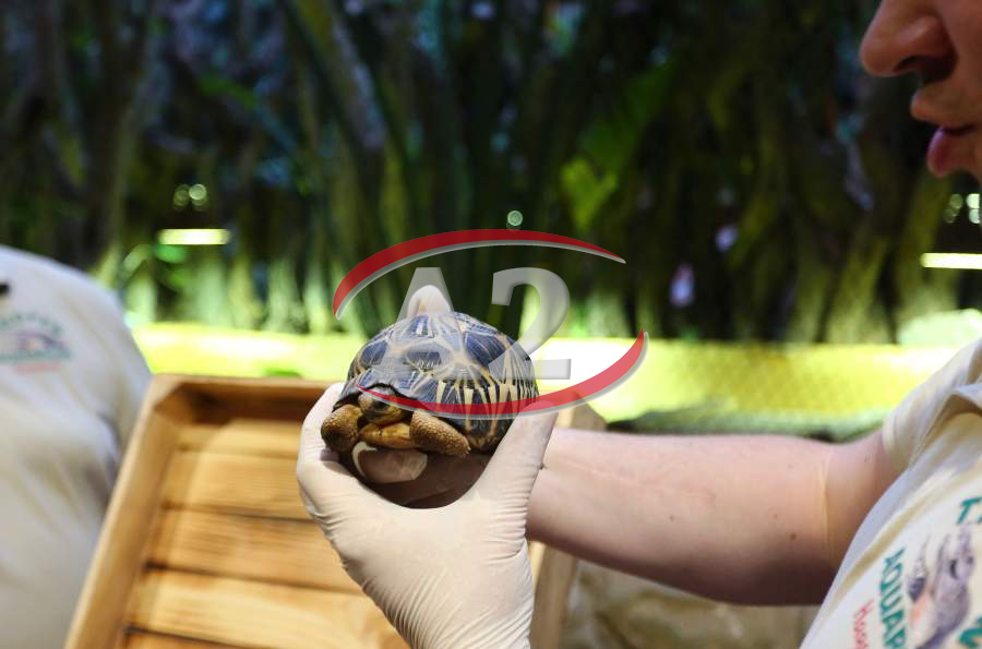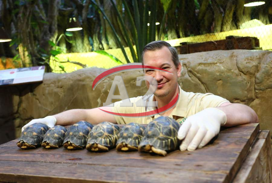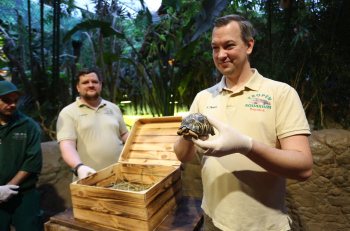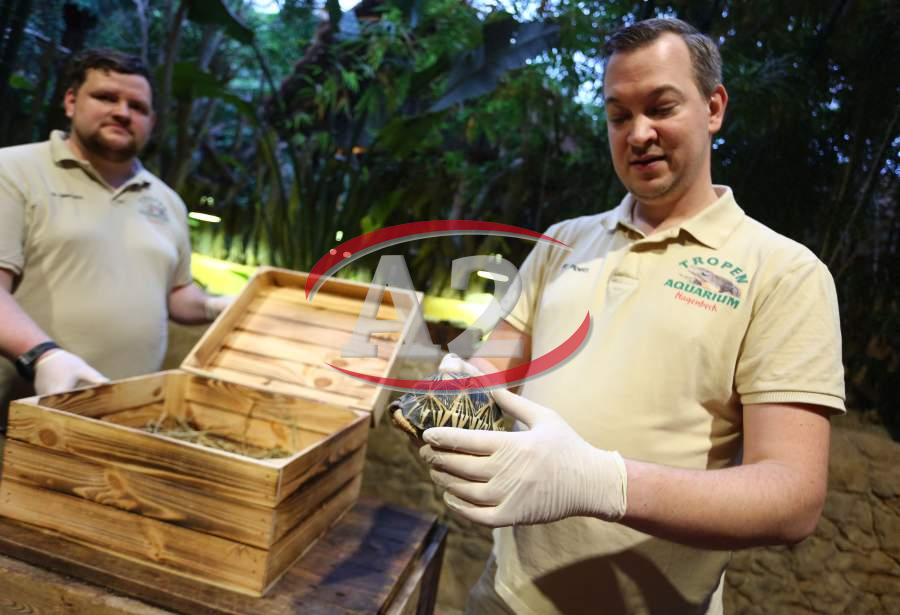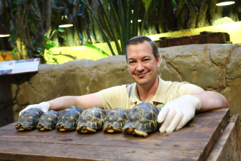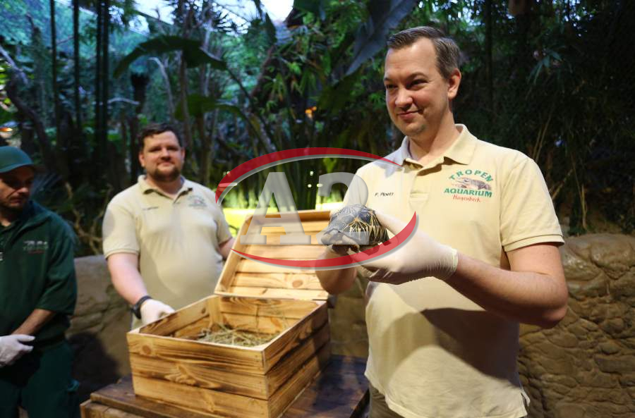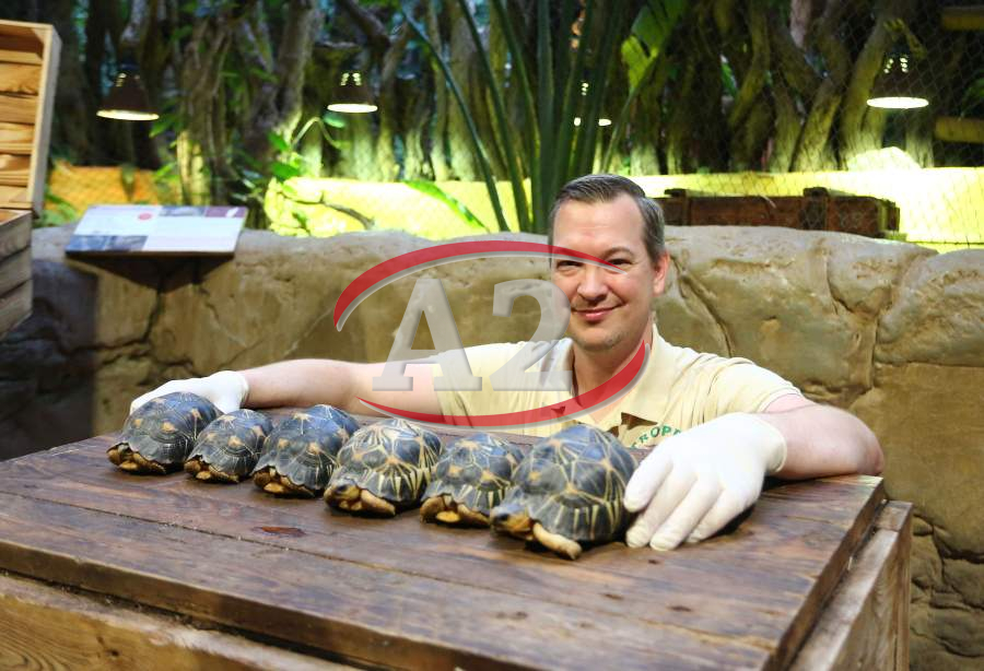 Sechs neue und stark gefaehrdete Strahlenschildkroeten ziehen in das Tropen-Aquarium bei Hagenbeck ein, Florian Ploetz (Bereichsleiter Terraristik) und sein Team zeigen die neue Landschildkroetenart im Katta-Dorf