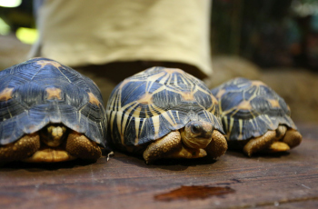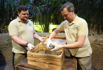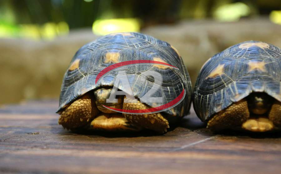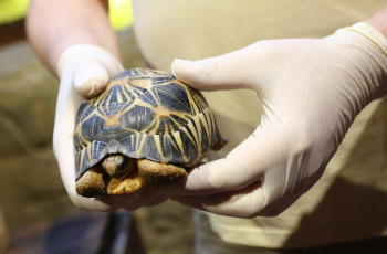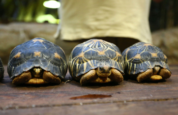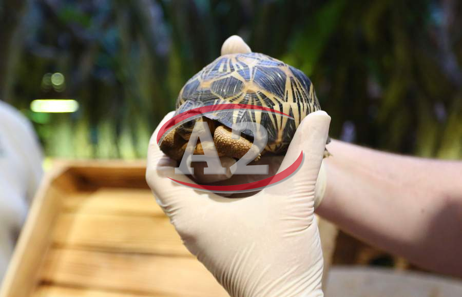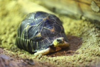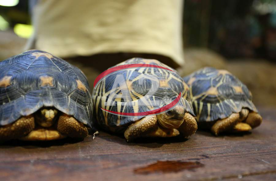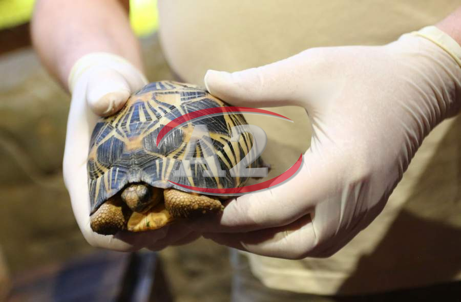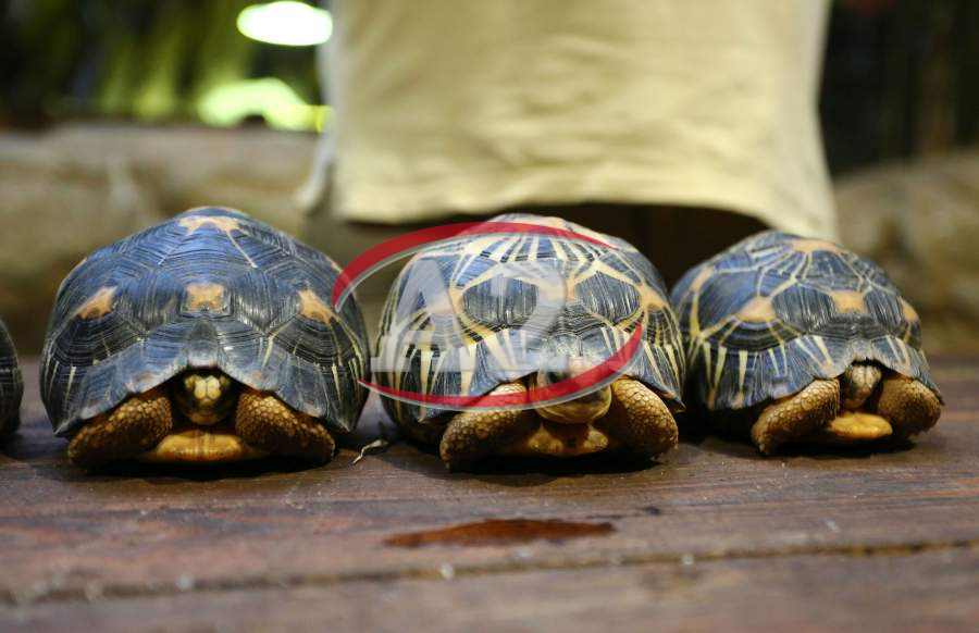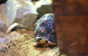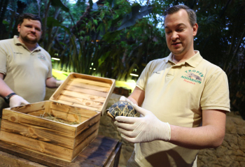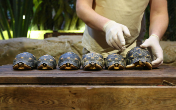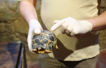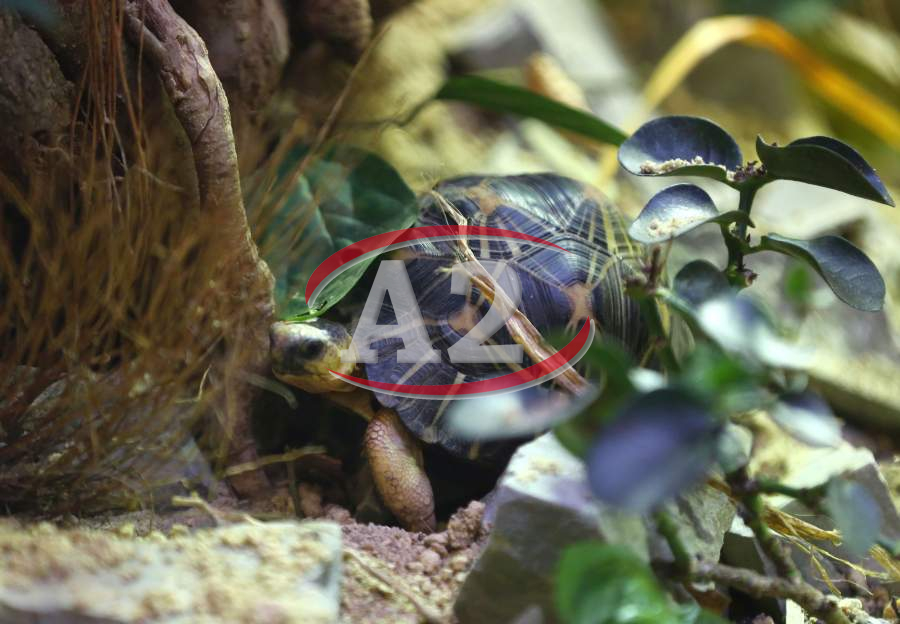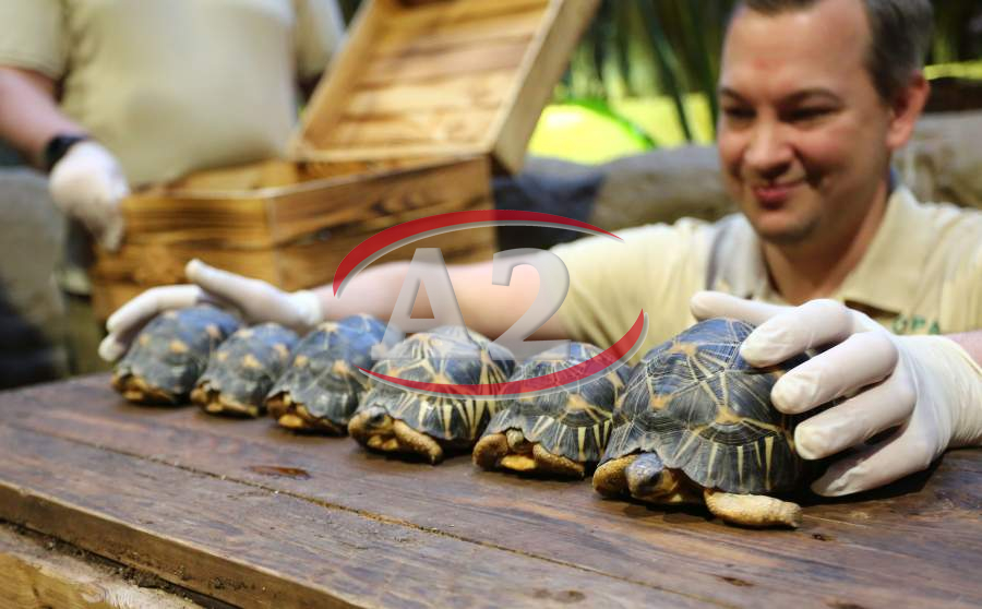 Sechs neue und stark gefaehrdete Strahlenschildkroeten ziehen in das Tropen-Aquarium bei Hagenbeck ein, Florian Ploetz (Bereichsleiter Terraristik) und sein Team zeigen die neue Landschildkroetenart im Katta-Dorf