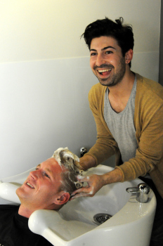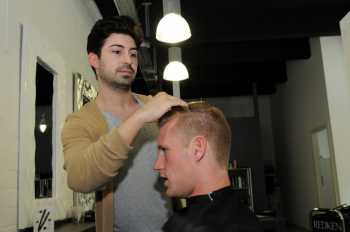 Andre Hahn (FCA) der Ex-OFC-Spieler blieb dem Stadionfriseur treu unter dem Motto G?ttlich sch?n bringt Friseur Deniz Dayulcu den Kopf von Andre in Form