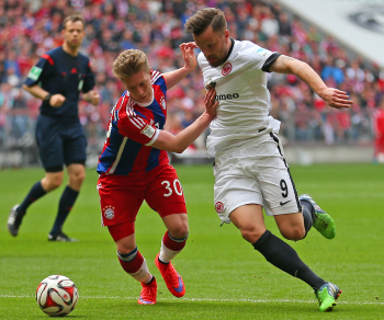 MUENCHEN,GERMANY,11.APR.15 - FUSSBALL - 1. DFL, 1. Deutsche Bundesliga, FC Bayern Muenchen vs Eintracht Frankfurt. Image shows Stefan Aigner (Frankfurt) and Javi Martinez (Bayern). ********* Quelle: A2/Hartenfelser