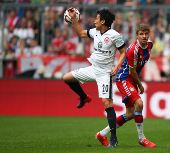 MUENCHEN,GERMANY,11.APR.15 - FUSSBALL - 1. DFL, 1. Deutsche Bundesliga, FC Bayern Muenchen vs Eintracht Frankfurt. Image shows Makoto Hasebe (Frankfurt) and Thomas Mueller (Bayern). ********* Quelle: A2/Hartenfelser