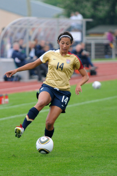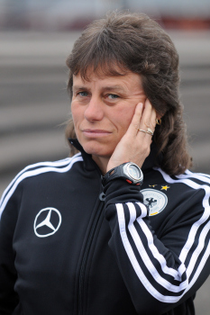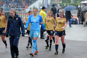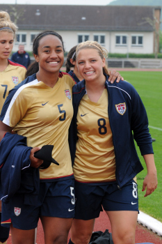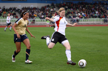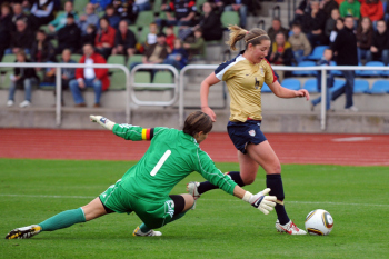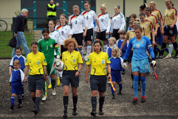 26.05.2010, Länderspiel, U 23-Nationalmannschaft der Frauen, Deutschland:USA,angeführt vom Schiedsrichtergespann Katrin Rafalski, Matrina Storch-Schäfer, Sabine Stadler laufen die Mannschaften ein