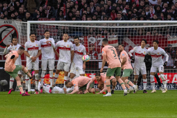 Marvin Ducksch (SV Werder Bremen) beim Freistoß, v.l. Juan Jose Perea Mendoza, Konstantinos Mavropanos, Atakan Karazor, Luca Pfeiffer, Chris Führich am Boden (VfB Stuttgart), Amos Pieper, Niklas Stark tauchen ab, Anthony Jung, Niclas Füllkrug (SV Werder Bremen), Genki Haraguchi und Hiroki Ito (VfB Stuttgart).