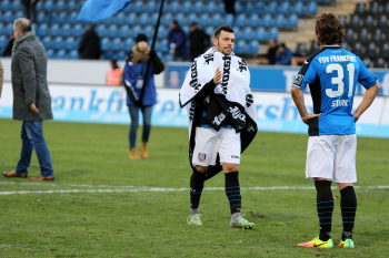 Yannick Stark (FSV Frankfurt) l??t seine Entt?uschung ?ber die vergeben Chance raus und bekommt Trost vom Gegener Torwart Mark Flekken (MSV Duisburg)