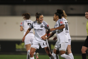 21.11.2021, xcex, GER, Leverkusen, Frauenfussball, 1. Bundesliga, DIE LIGA, FLYERALARM Frauen-Bundesliga Saison 2021/2022, Spieltag 9, SGE, Bayer 04 Leverkusen - Eintracht Frankfurt Frauen, Torjubel Eintracht Frankfurt Frauen, Jubel, Freude, Emotionen, Goal celebration