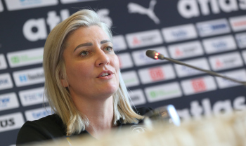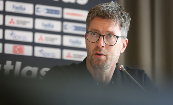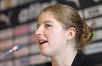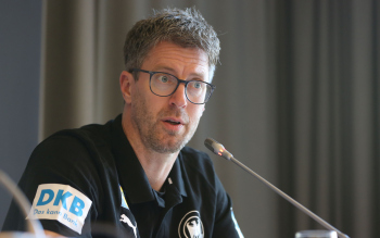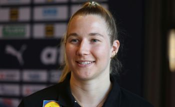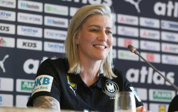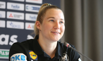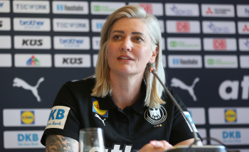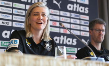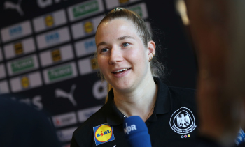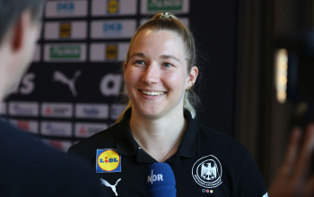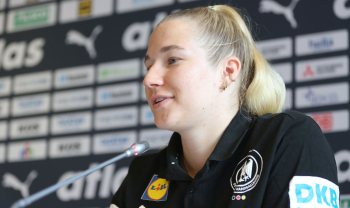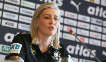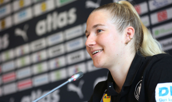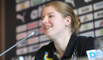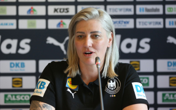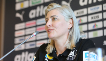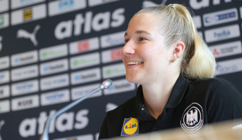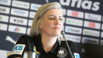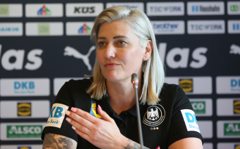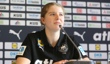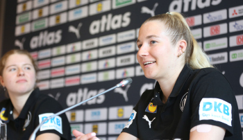 07.04.2025, xcex, GER, Hamburg, Handball, Frauen-Nationalmannschaft, DHB Frauen, Medientermin, Deutscher Handballbund, DHB-Frauen Pressekonferenz, Nina Engel (Nationalspielerin), Anja Althaus (Teammanagerin), Markus Gaugisch (Bundestrainer), Katharina Filter (Nationalspielerin, v.l.n.r., DHB Frauen)