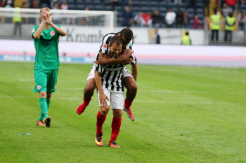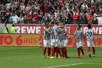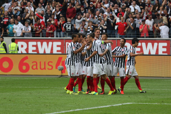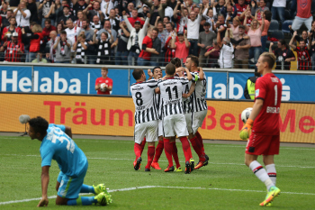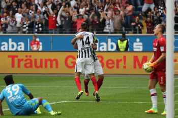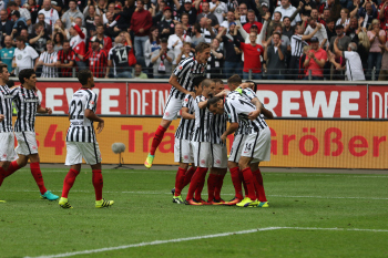 17.09.2016 Frankfurt, Commerzbankarena 1. Bundesliga Fu?ball GER 1.BL 1. BL 2016 2017 (SGE) Eintracht Frankfurt - Bayer 04 Leverkusen Schlussjubel bei Szabolcs Huszti , der Timothy ?Timmy? Chandler (Eintracht Frankfurt) auf dem R?cken tr?gt ***** Foto: Peter Hartenfelser