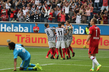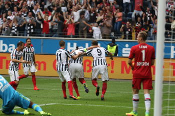 17.09.2016 Frankfurt, Commerzbankarena 1. Bundesliga Fu?ball GER 1.BL 1. BL 2016 2017 (SGE) Eintracht Frankfurt - Bayer 04 Leverkusen Torjubel nach dem Tor zum 1:0 Torsch?tze Alexander Meier mit Haris Seferovic (Eintracht Frankfurt) Frust bei Benjamin Henrichs (Leverkusen) und Torwart Bernd Leno (Leverkusen) ***** Foto: Peter Hartenfelser