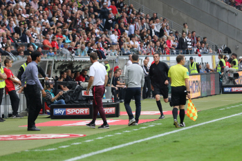 17.09.2016 Frankfurt, Commerzbankarena 1. Bundesliga Fu?ball GER 1.BL 1. BL 2016 2017 (SGE) Eintracht Frankfurt - Bayer 04 Leverkusen Christoph Bornhorst (4. Schiedsrichter) rennt zu Sportdirektor Bruno H?bner (Eintracht Frankfurt) da dieser seine Zone vverlassen hat ***** Foto: Peter Hartenfelser