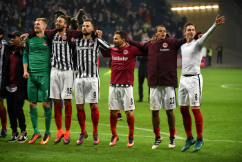 Schlussjubel nach dem 2:1 Sieg mit stolz geschwelter Brust Torwart Lukas Hradecky , Michael Hector , Torsch?tzen Haris Seferovic und Szabolcs Huszti , Timothy Chandler, Bastian Oczipka (Eintracht Frankfurt)