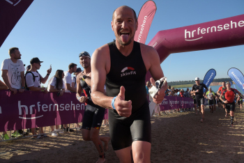 30.06.2019 Frankfurt am Main, Römerberg Mainova IRONMAN European Championship Im Ziel der Dritte Franz Löschke (GER) erschöpt aber glücklich genißt den Beifall ********** Foto: Peter Hartenfelser