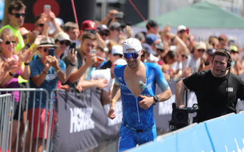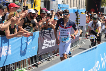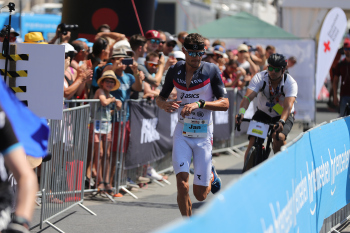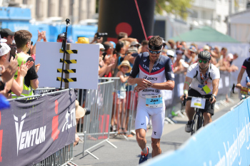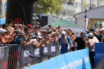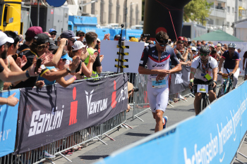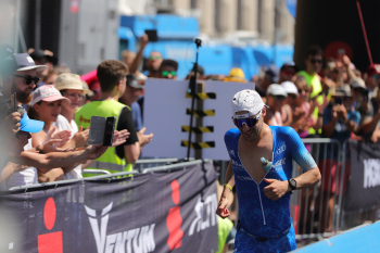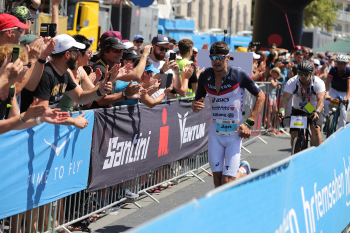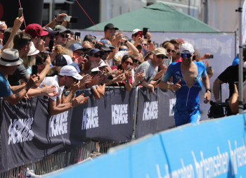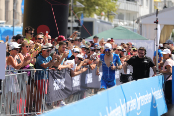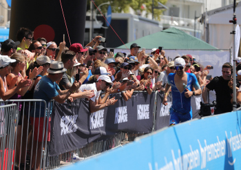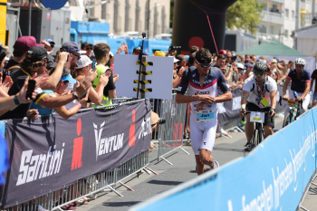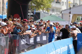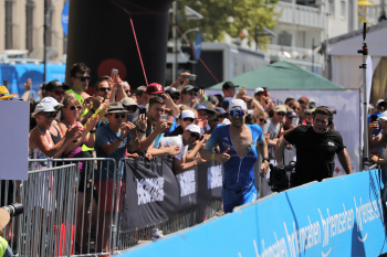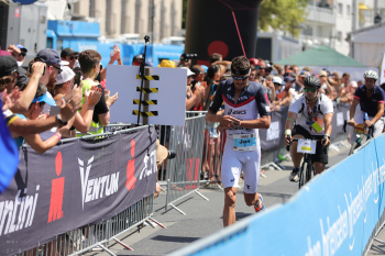 30.06.2019 Frankfurt am Main, Römerberg Mainova IRONMAN European Championship Lucas Amirault (FRA) kommt aus der Wechselzone und geht auf die Strecke, die Zuschauern feiern ihn ********** Foto: Peter Hartenfelser