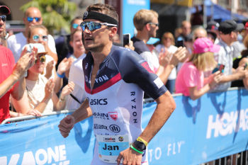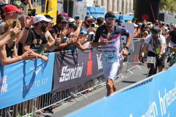 30.06.2019 Frankfurt am Main, Römerberg Mainova IRONMAN European Championship Patrick Lange (GER) kommt aus der Wechselzone und geht auf die Strecke, die Zuschauern feiern ihn ********** Foto: Peter Hartenfelser