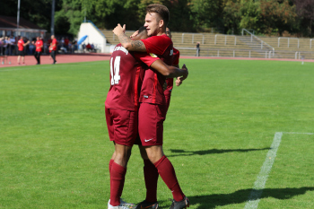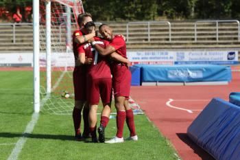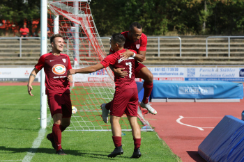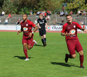 Carlos McCrary (14, Spvgg. 03 Neu-Isenburg) jubelt nach seinem Tor zum 2:0 hier mit Marc Züge (9, Spvgg. 03 Neu-Isenburg), Marco Betz (5, Spvgg 03 Neu-Isenburg),