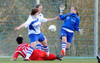 v.l. Tor zum 2:1 fuer Kickers, Denise Goethel (Wiking), Torschuetzin Romina Kessler (Kickers), Nadine Roith (Wiking), Michelle Kessler (Wiking)