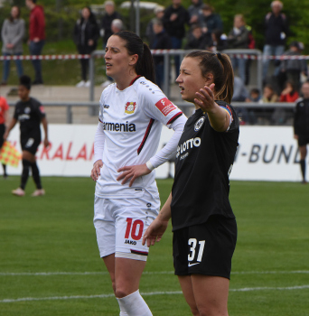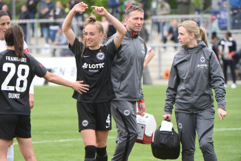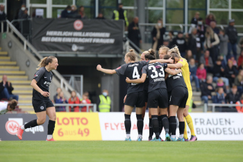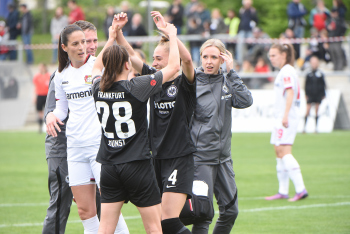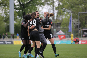 FLYERALARM Frauen-Bundesliga Saison 2021/2022, Spieltag 20, SGE, B04, Eintracht Frankfurt Frauen - Bayer 04 Leverkusen, Torjubel Eintracht Frankfurt Frauen, Jubel, Freude, Emotionen, goal celebration, Sophia Kleinherne, Sandrine Mauron (SGE)
