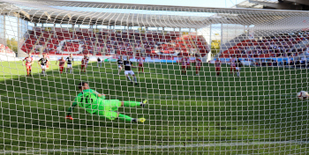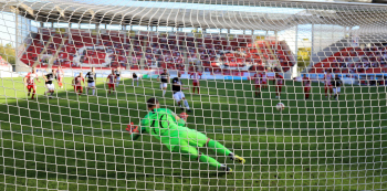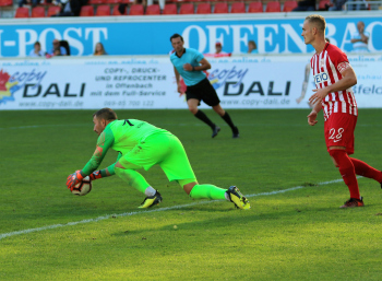 Manuel Pflumm (Balingen) verwandelt den Elfmeter zum 1:1 Torwart Daniel Endres (16, OFC) in der falschen Ecke, Tor