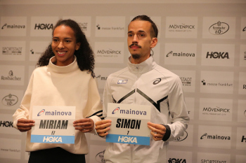 27.10.2023 Frankfurt am Main, Mövenpick-Hotel Pre-Race-Pressekonferenz 40. Mainova Frankfurt Marathon Das schnelle Regensburger Duo Miriam Dattke und Simon Boch wollen beim Mainova Frankfurt-Marathon die Olympia-Norm für Paris schaffen ********* Foto: A2Bildagentur