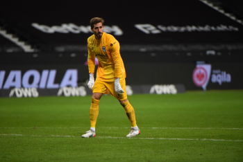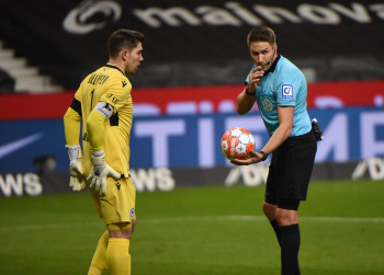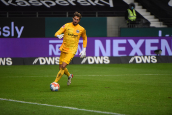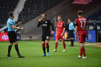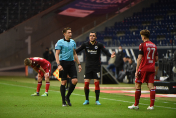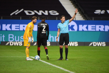 Torwart Kevin Trapp ( 1, Eintracht Frankfurt), Evan N'Dicka (2, Eintracht Frankfurt), Schiedsrichter Tobias Reichel