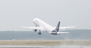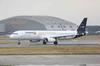 der Lufthansa Fanhansa Mannschaftsflieger hebt ab und ist auf dem Weg nach Russland, Flugzeug, Startbahn, Start