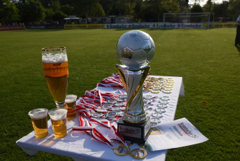 21.05.2018 xkhx Stadtallendorf Hessenpokalfinale 2018 TSV Steinbach gegen KSV Hessen Kassel Symbolbild der Hessenpokal, Krombacher Bier und die Medaillen ****** Foto: Peter Hartenfelser