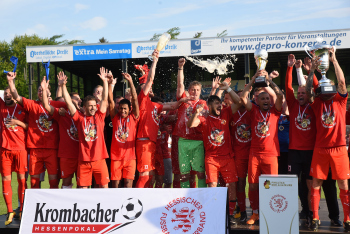 21.05.2018 xkhx Stadtallendorf Hessenpokalfinale 2018 TSV Steinbach gegen KSV Hessen Kassel Der Hessenpokalsieger heißt TSV Steinbach - grosser Jubel der Spieler mit dem Pokal ****** Foto: Peter Hartenfelser