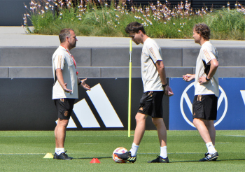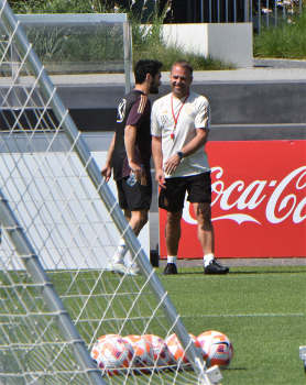 15.06.2023 Frankfurt am Main, DFB-Campus DFB Training der Deutschen Nationalmannschaft was soll ich machen scheint Bundestrainer Hansi Flick seine CO-Trainer zu fragen ********* Foto: Peter Hartenfelser