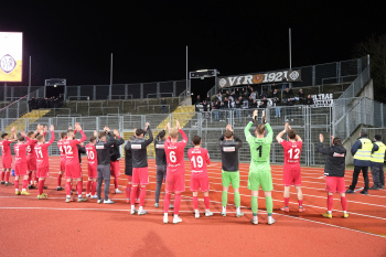 21.03.2023 xkhx Kassel Auestadion Regionalliga Südwest Saison 2022/2023 KSV Hessen Kassel - VfR Aalen Jubel Nach dem 1:2 Sieg feiern die Spieler des VfR Aalen mit den mitgereisten Fans ********* Foto: Peter Hartenfelser