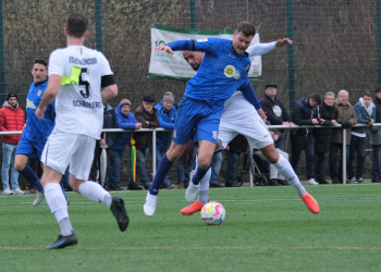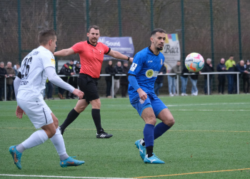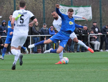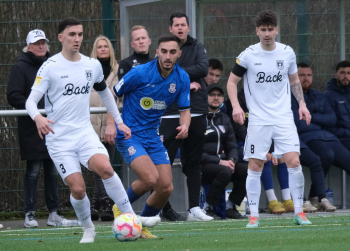 18.02.2023 xkhx Stadtallendorf Bitburger Hessenpokal 2022/2023 Viertelfinale Eintracht Stadtallendorf - FSV Frankfurt AMAR ZILDZOVIC (Eintracht Stadtallendorf) gegen AHMED AZAOUAGH (7, FSV Frankfurt) unter Beobachtung von Schiedsrichter Alexander Hauser ********* Foto: Peter Hartenfelser