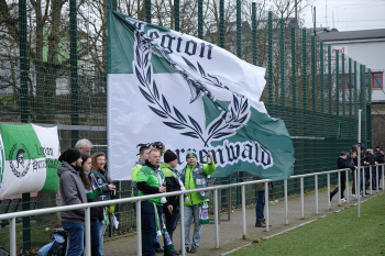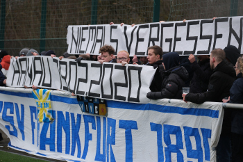 18.02.2023 Stadtallendorf Bitburger Hessenpokal 2022/2023 Viertelfinale Eintracht Stadtallendorf - FSV Frankfurt Die mitgereisten Fans / Ultras vom FSV Frankfurt gedenken den Opfern von HANAU ********* Foto: Peter Hartenfelser